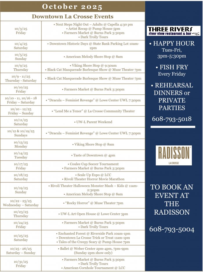 is an inviting lounge and restaurant serving fresh takes on Midwest classics & Wisconsin favorites along with local beers & signature cocktails. Located in historic Downtown La Crosse, Wisconsin, featuring stunning views of the Mississippi River, Three Rivers offers Happy Hour specials, Friday Night Fish Fries, & a Prime Rib Special on Saturdays along with the best Old Fashioneds in La Crosse!